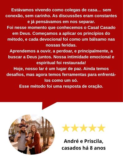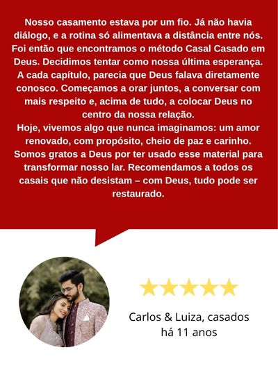 Você encontrará ensinamentos profundos sobre o propósito do casamento, como lidar com crises conjugais, restaurar o amor e a intimidade com santidade, além de orientações práticas para cultivar um relacionamento saudável. O Metodo também inclui orações guiadas, bônus devocionais de 7 dias para casais e exercícios práticos.